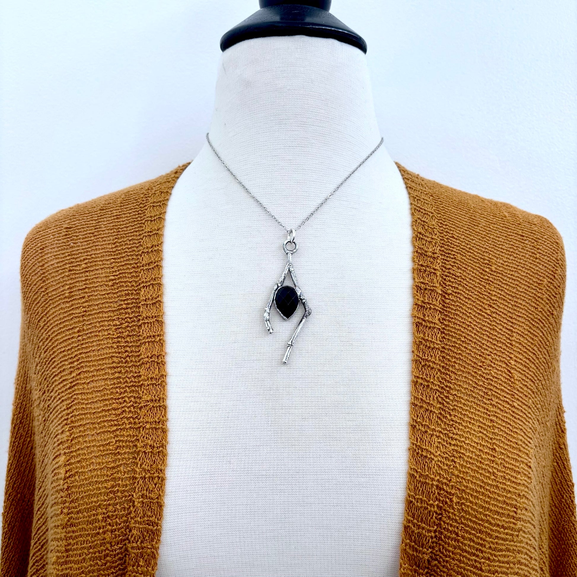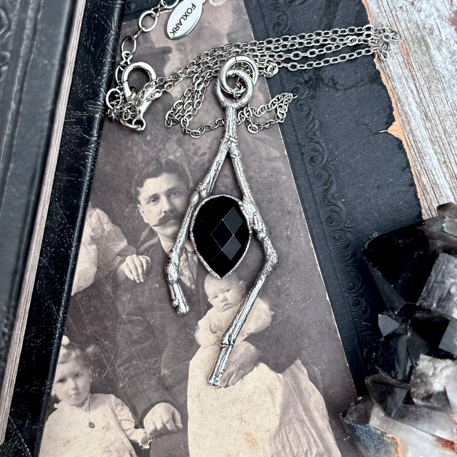 Get in touch with our contact page or you can always contact us on our FOXLARK Instagram www.instagram.com/foxlark or Facebook pages www.Facebook.com/foxlark , or through email foxlarkalchemy@gmail.comEarthy, layered, and full of natural magic—this fine silver necklace frames black onyx in hand-formed twigs, capturing the grounding beauty of the earth in a striking crystal statement piece.