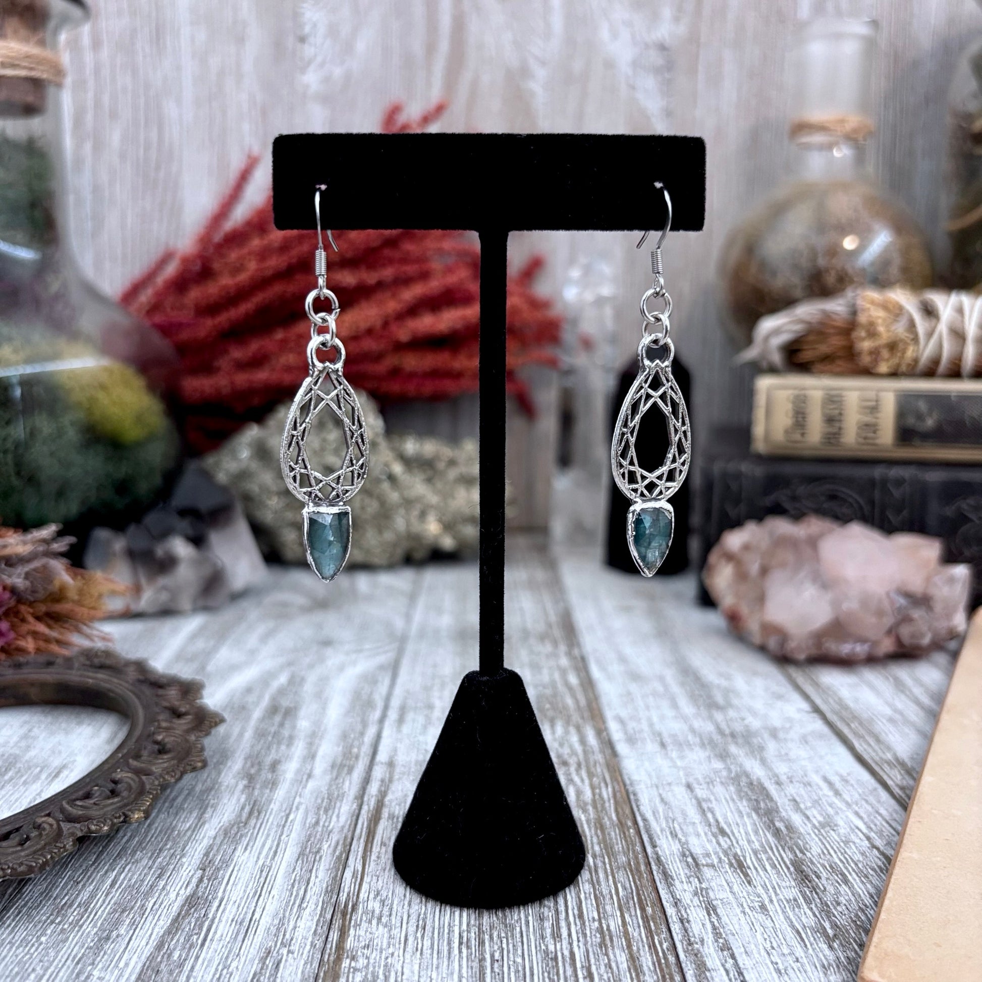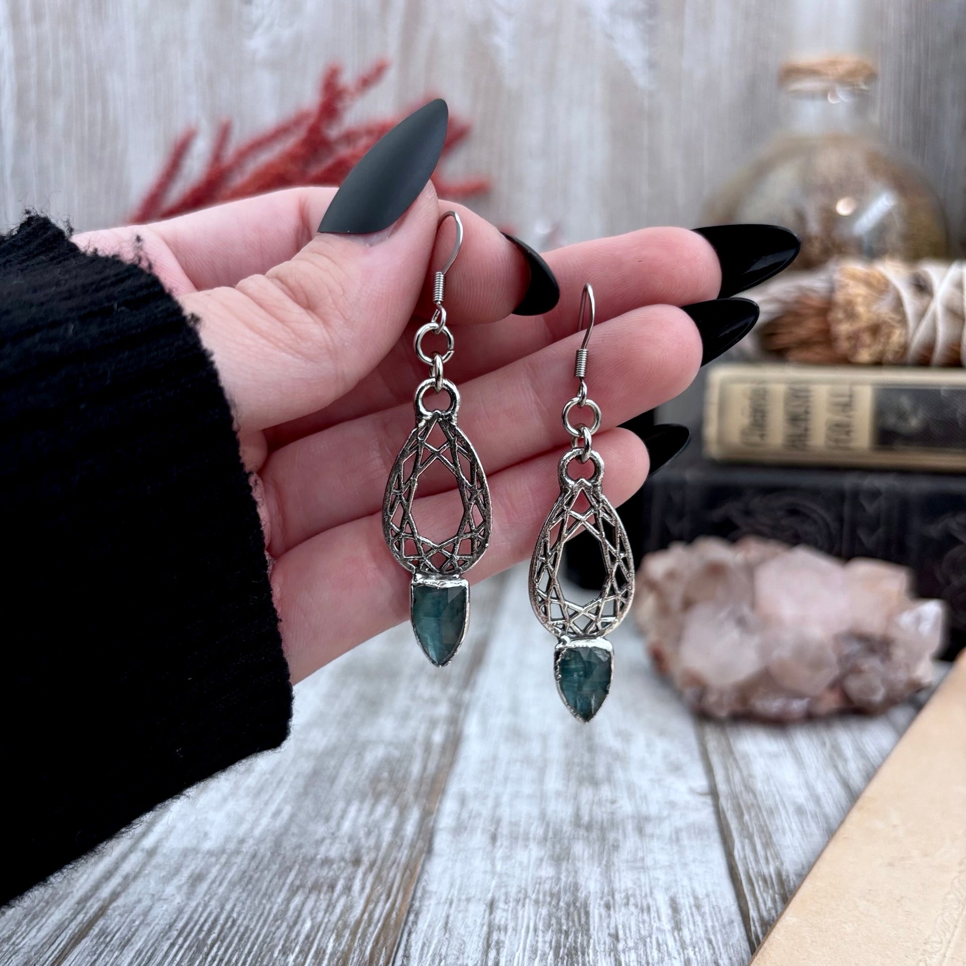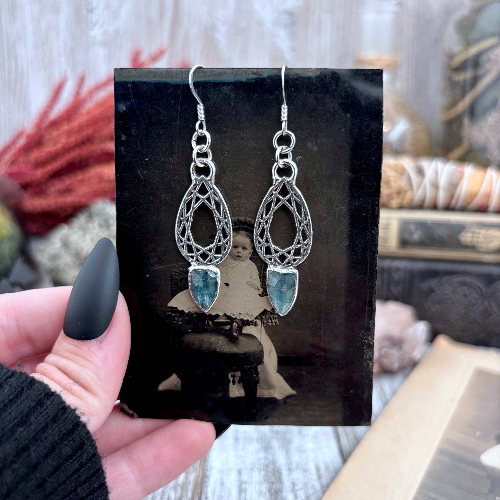 Blue Kyanite Fine Silver Crystal Drop Earrings / Long Dangle Witchy Earrings