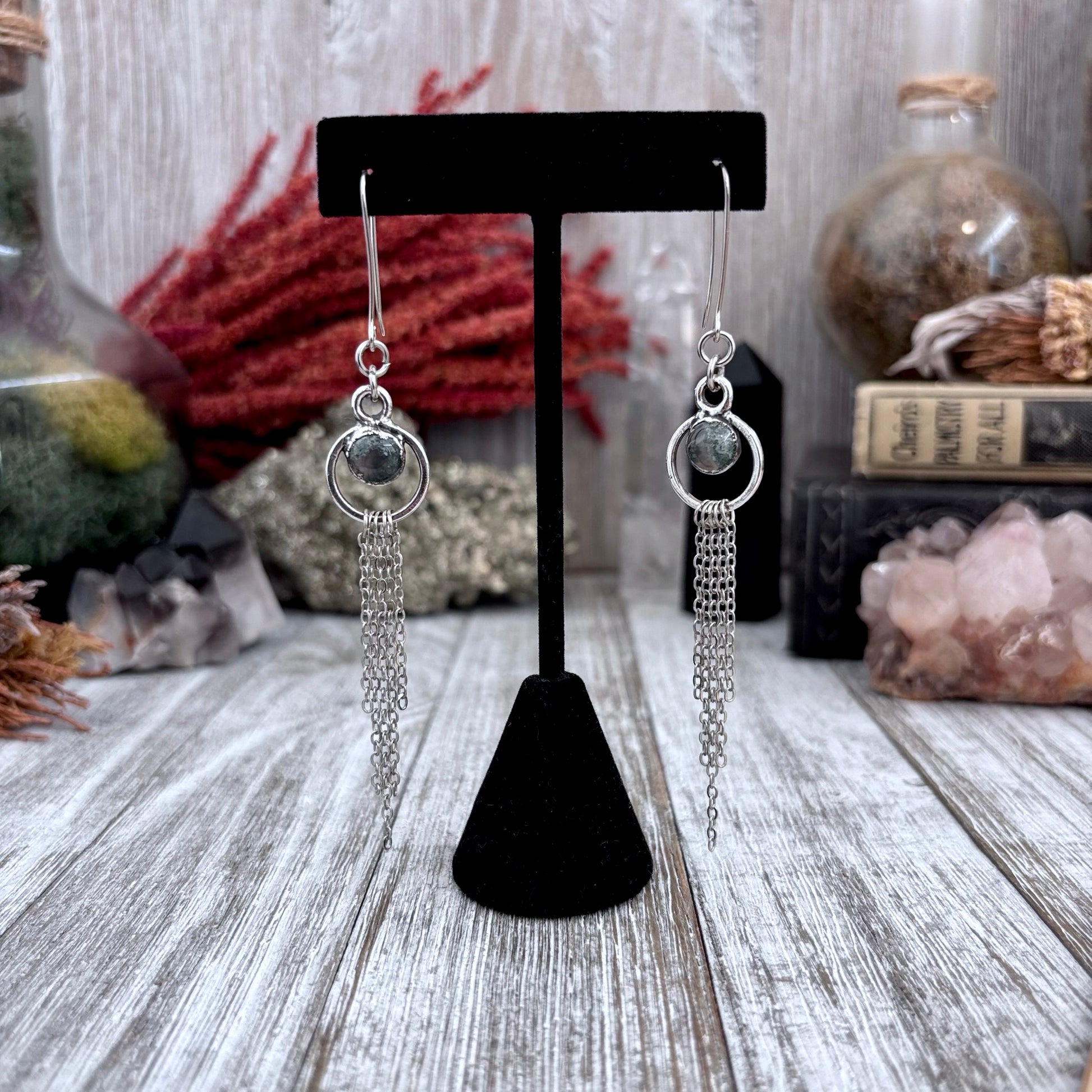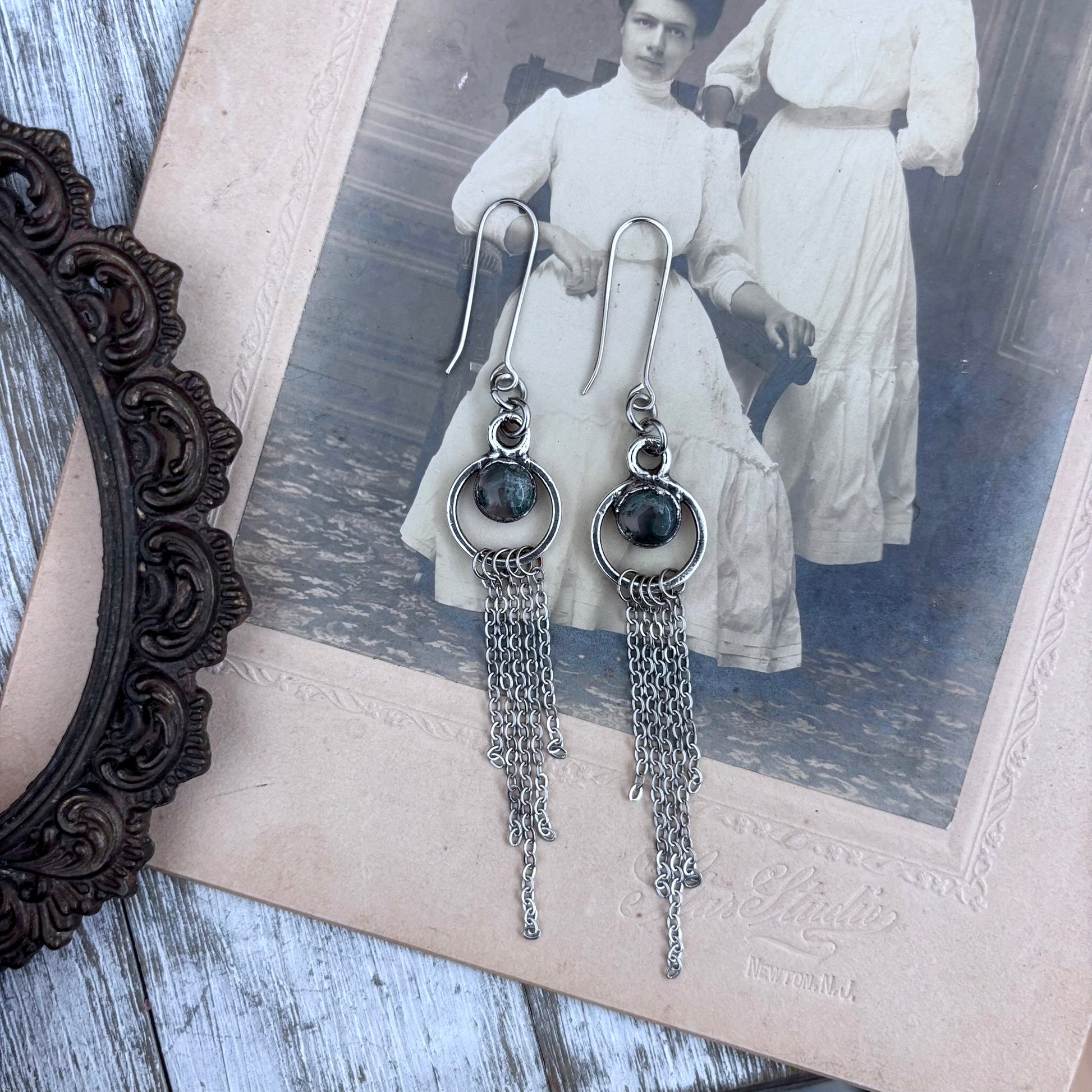 Moss Agate Hoop And Fringe Fine Silver Crystal Earrings / Long Dangle Witchy Earrings
