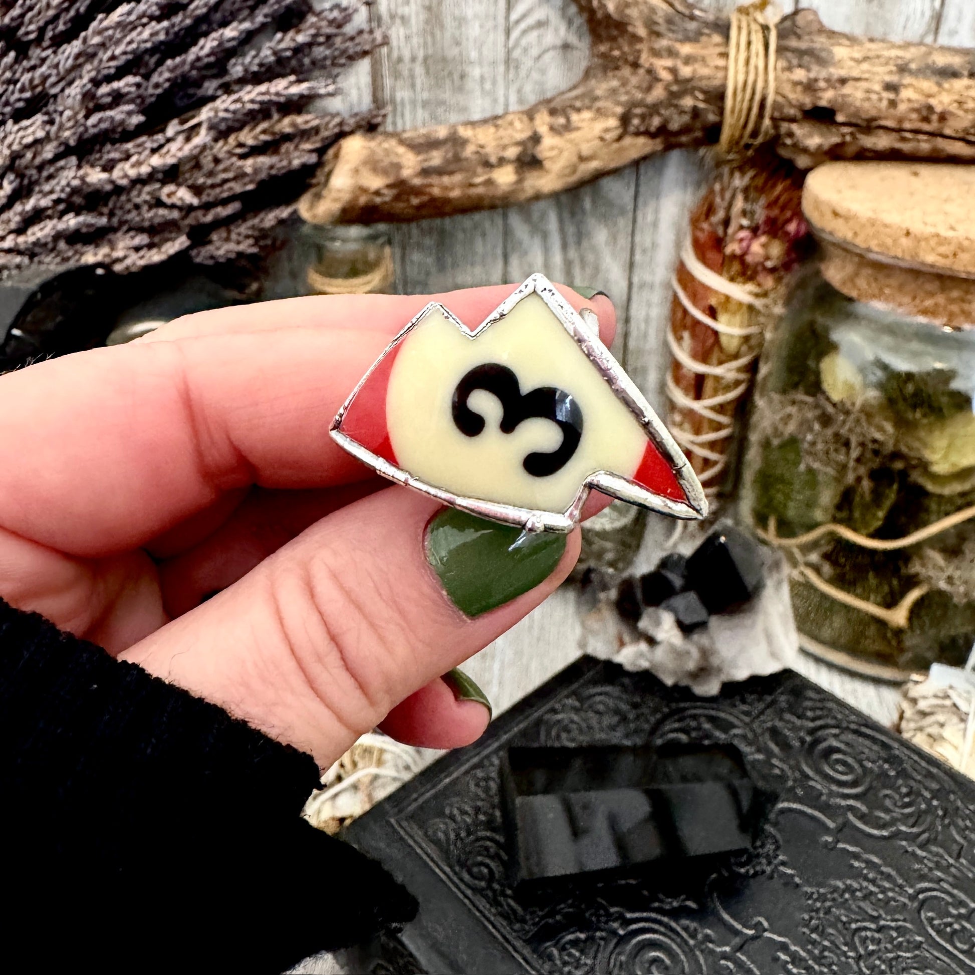 Get in touch with our contact page or you can always contact us on our FOXLARK Instagram www.instagram.com/foxlark or Facebook pages www.Facebook.com/foxlark , or through email foxlarkalchemy@gmail.comA slice of a real pool ball, cut down and set in fine silver. Unapologetically bold , the kind of piece that doesn’t blend in. Smooth, weighty, and a little rebellious, it carries that dive bar, late-night energy in a form you can wear anywhere.