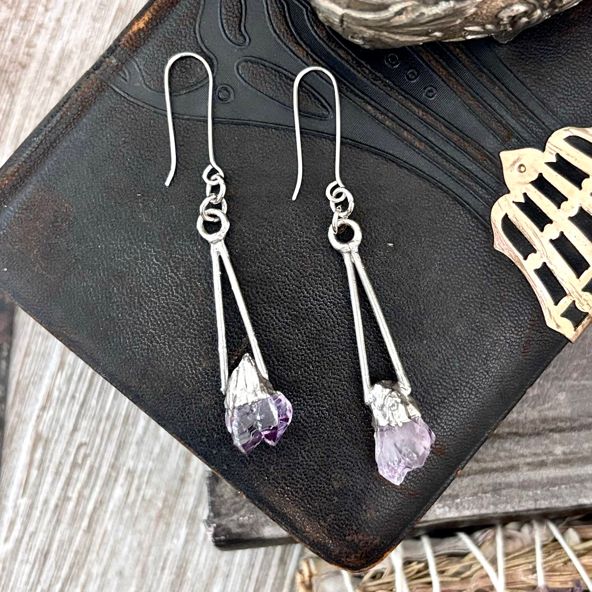 Raw Amethyst Fine Silver Crystal Dangle Earrings / Long Dangle Witchy Earrings