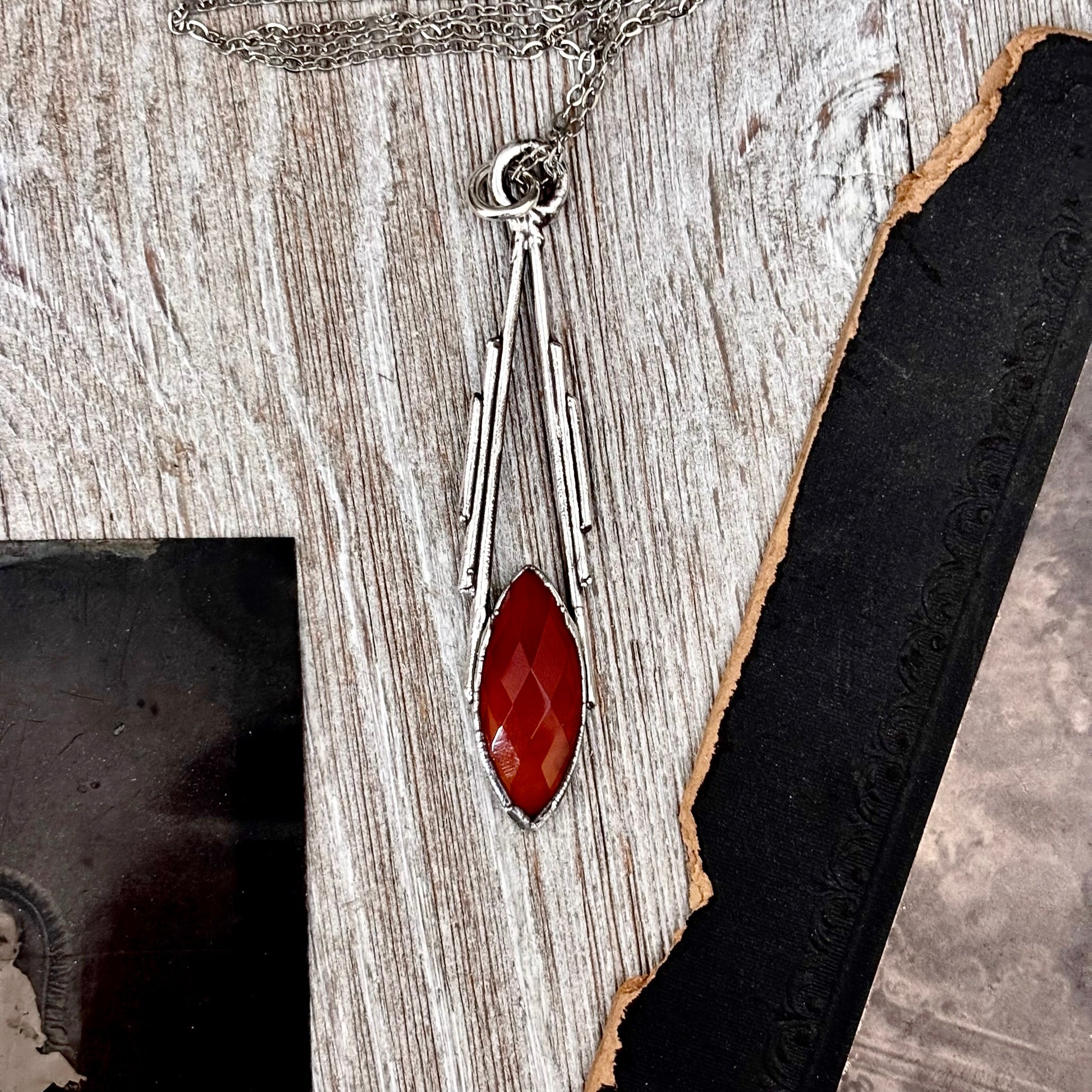 Get in touch with our contact page or you can always contact us on our FOXLARK Instagram www.instagram.com/foxlark or Facebook pages www.Facebook.com/foxlark , or through email foxlarkalchemy@gmail.comRed carnelian set in fine silver and given a vintage patina turning it into a unique crystal statement necklace. This handmade crystal necklace is perfect worn alone or layered with with other pieces.