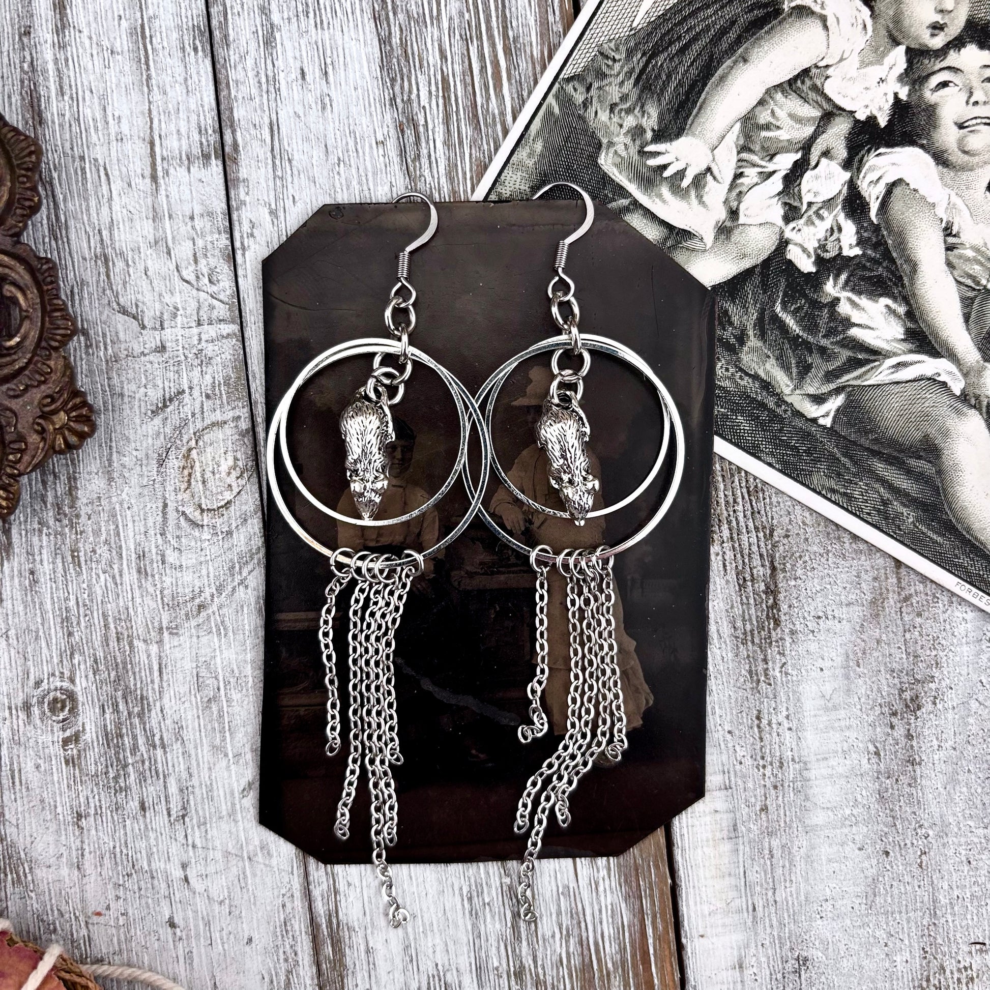 Silver Rat Earrings Stainless Steel Hoop and Fringe / Long Dangle Grunge Earrings