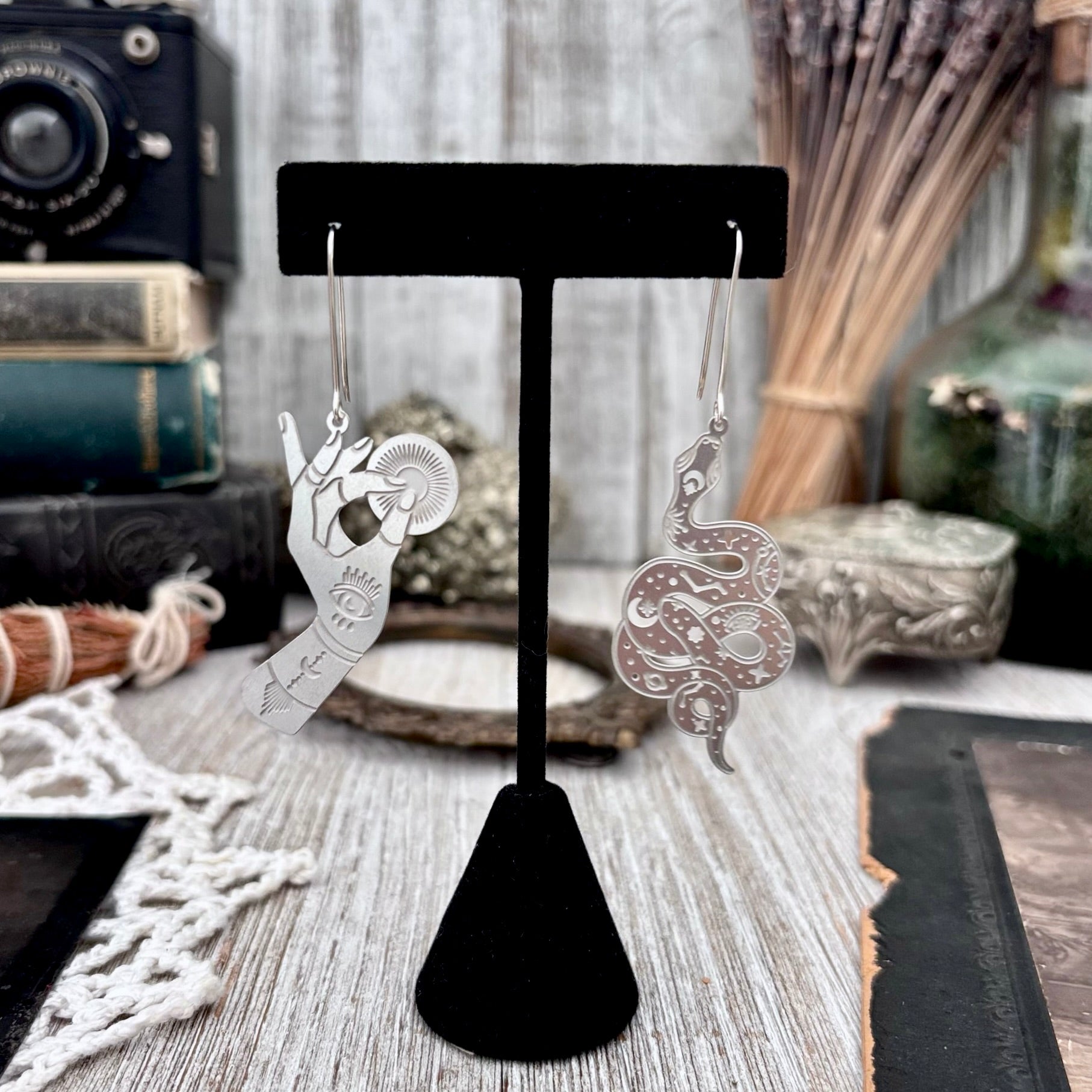 Stainless Steel Celestial Snake and Hand Earrings / Long Dangle Earrings