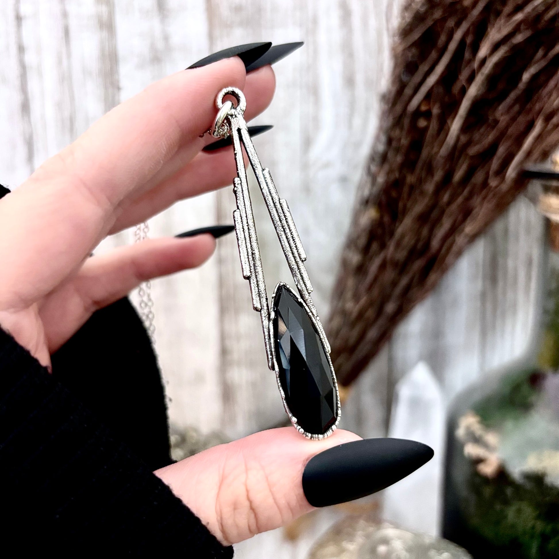 Get in touch with our contact page or you can always contact us on our FOXLARK Instagram www.instagram.com/foxlark or Facebook pages www.Facebook.com/foxlark , or through email foxlarkalchemy@gmail.comBlack Onyx set in fine silver and given a vintage patina turning it into a unique crystal statement necklace. This handmade crystal necklace is perfect worn alone or layered with with other pieces.