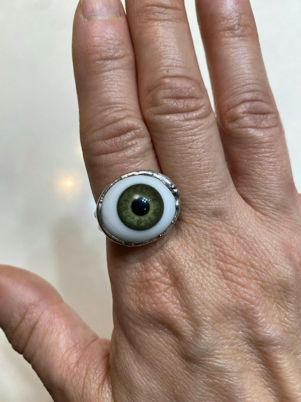 Get in touch with our contact page or you can always contact us on our FOXLARK Instagram www.instagram.com/foxlark or Facebook pages www.Facebook.com/foxlark , or through email foxlarkalchemy@gmail.comThe Green Iris Glass Eyeball Ring, crafted in fine silver, is made for those who thrive on bold, unapologetic style. More than just jewelry, this ring dares others to look closer while keeping its watchful gaze on everything. If you're all about turning heads and sparking curiosity, this ring's got its eye on you.