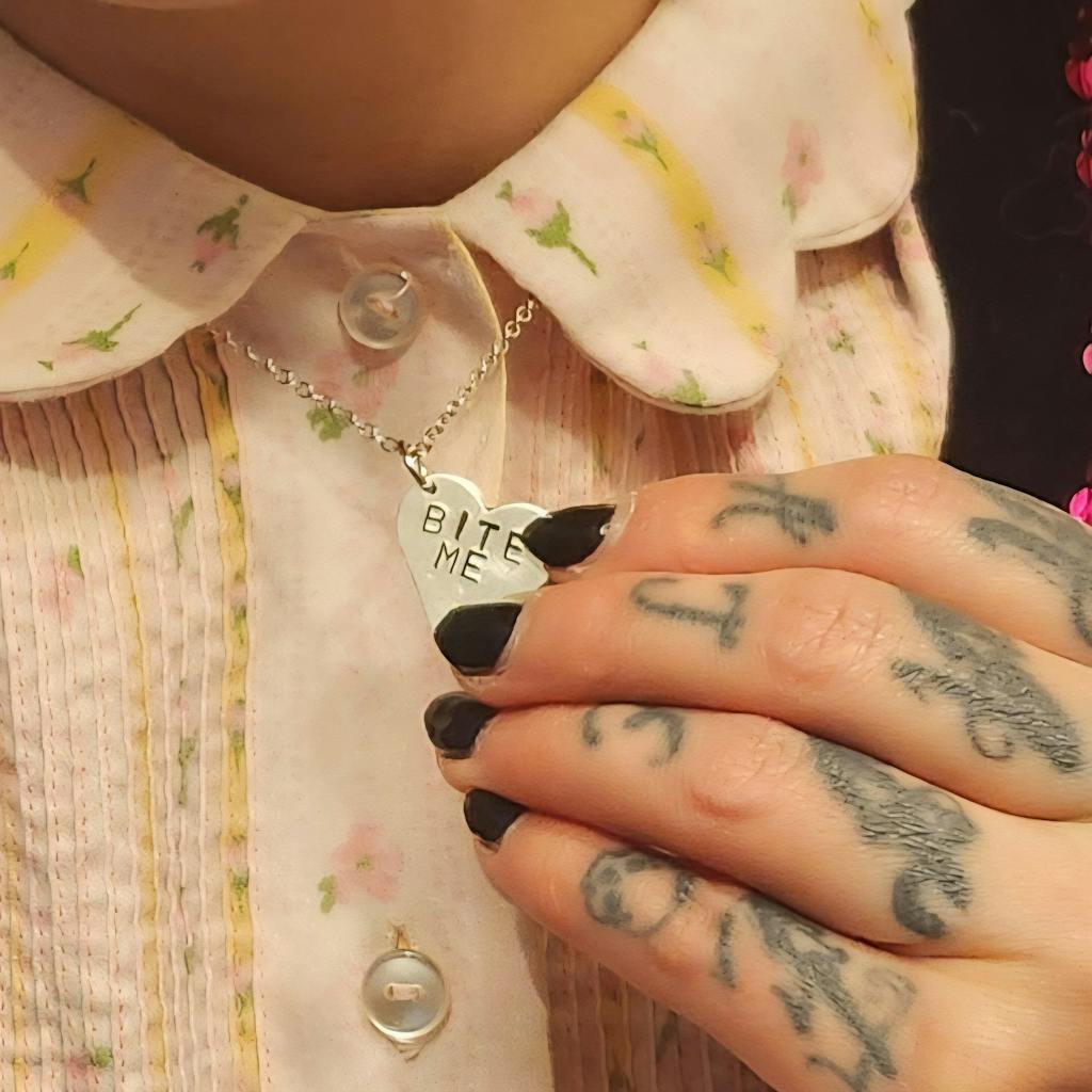 Get in touch with our contact page or you can always contact us on our FOXLARK Instagram www.instagram.com/foxlark or Facebook pages www.Facebook.com/foxlark , or through email foxlarkalchemy@gmail.comHand Stamped BITE ME Heart Necklace