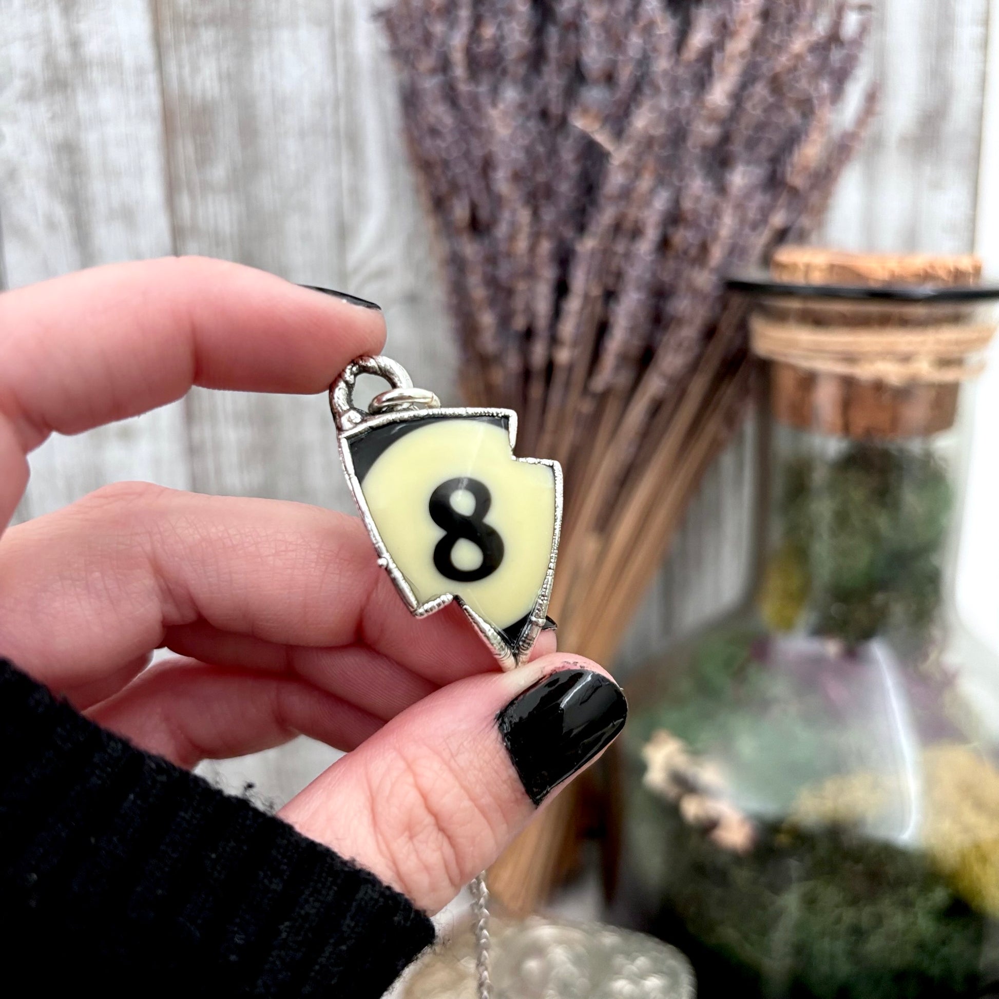 Get in touch with our contact page or you can always contact us on our FOXLARK Instagram www.instagram.com/foxlark or Facebook pages www.Facebook.com/foxlark , or through email foxlarkalchemy@gmail.com#8 Pool Ball set in fine silver and given a vintage patina turning it into a unique statement necklace. This handmade necklace is perfect worn alone or layered with other pieces.