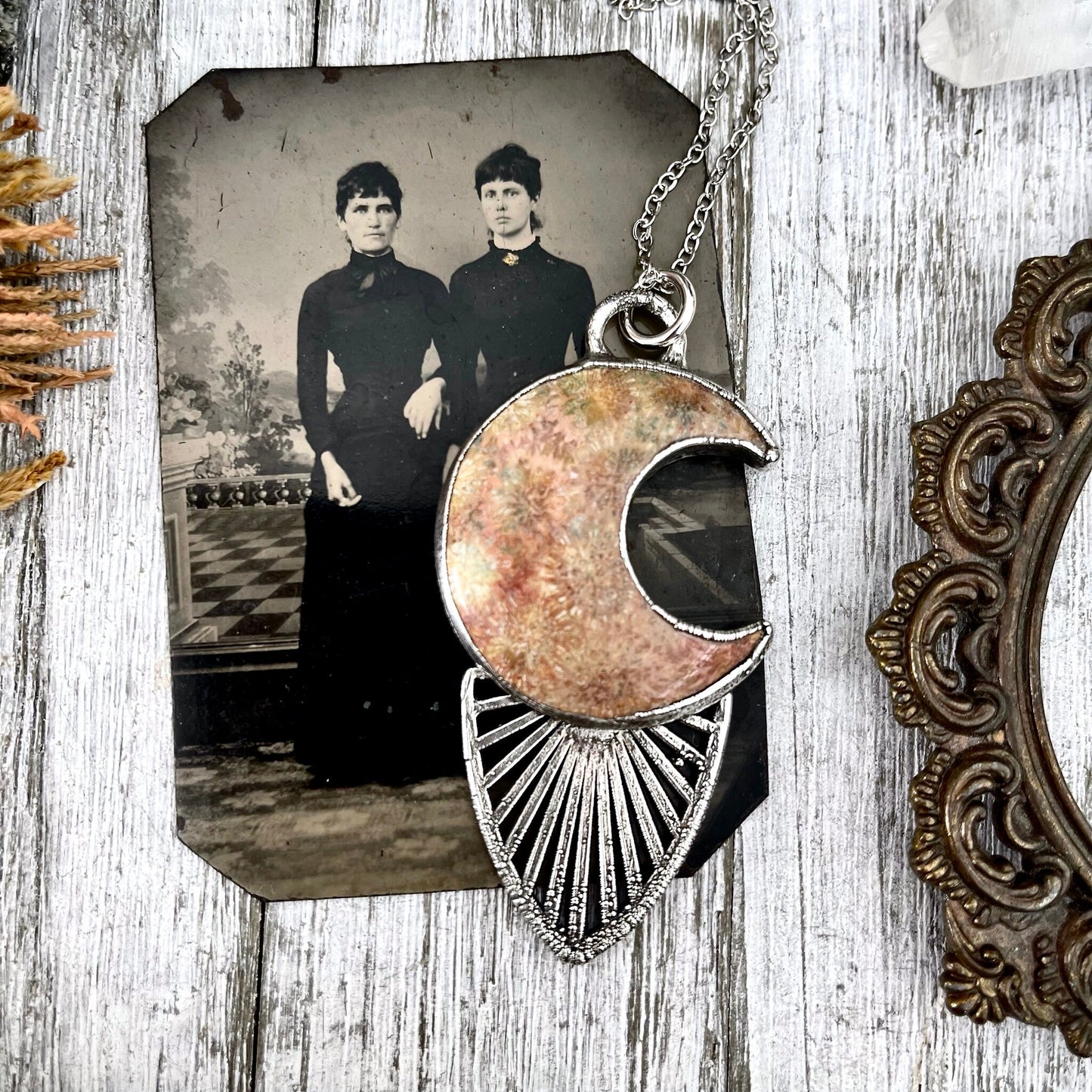 Fossilized Coral set in fine silver and given a vintage patina turning it into a unique crystal statement necklace. This handmade crystal necklace is perfect worn alone or layered with with other pieces.