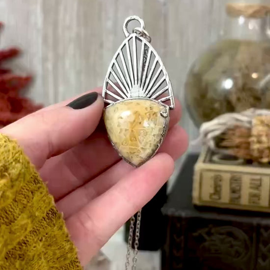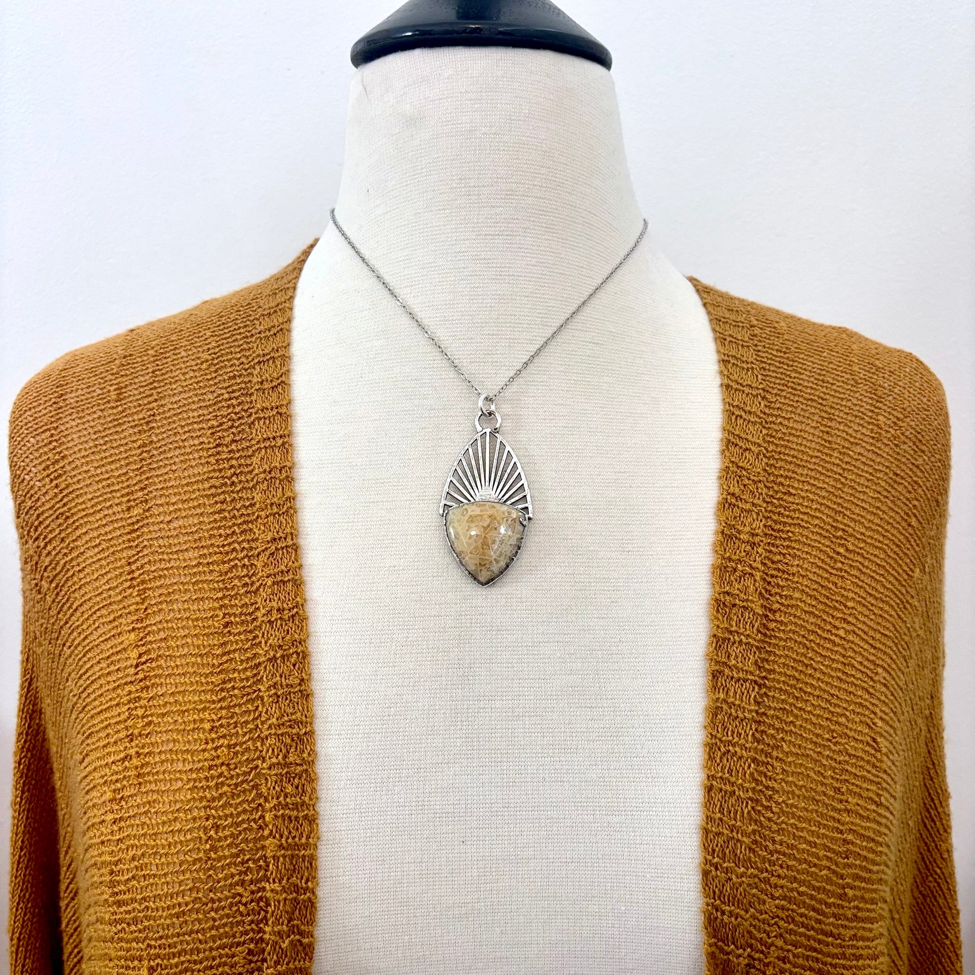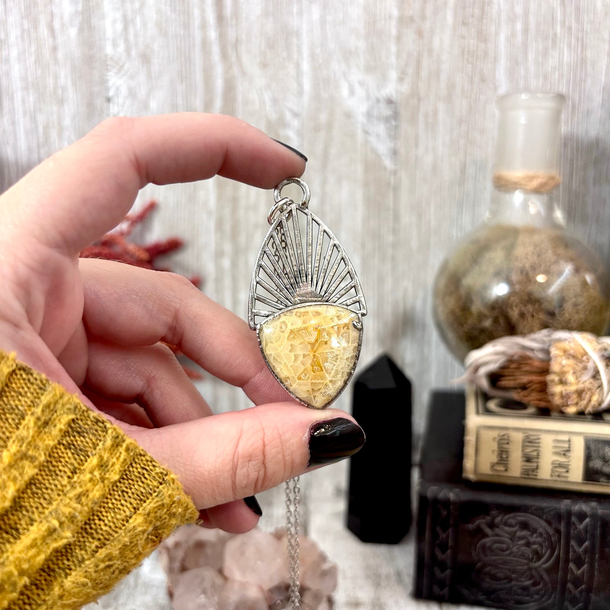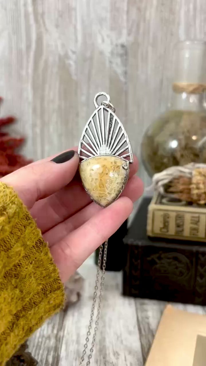 Get in touch with our contact page or you can always contact us on our FOXLARK Instagram www.instagram.com/foxlark or Facebook pages www.Facebook.com/foxlark , or through email foxlarkalchemy@gmail.comFossilized Coral set in fine silver and given a vintage patina turning it into a unique crystal statement necklace. This handmade crystal necklace is perfect worn alone or layered with with other pieces.