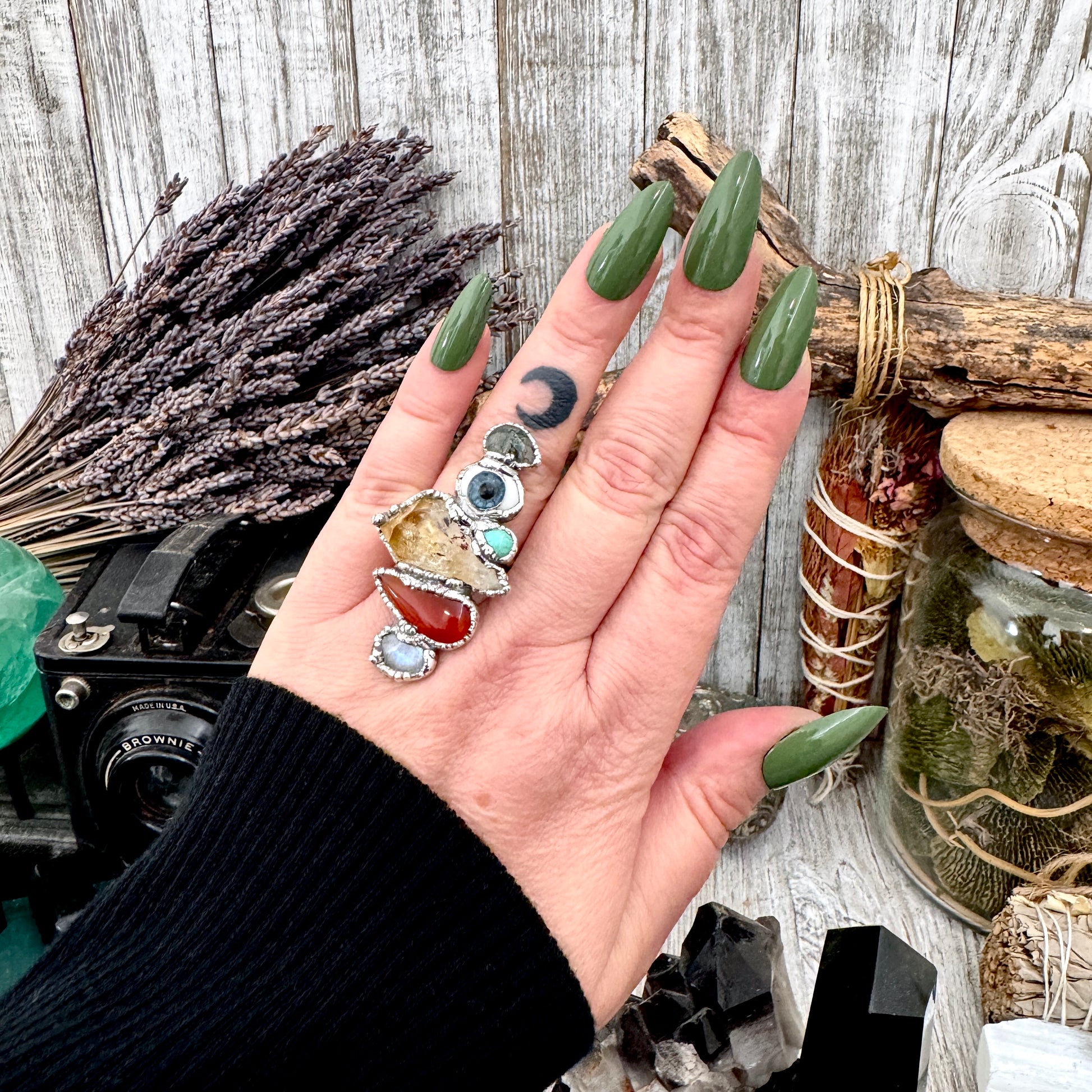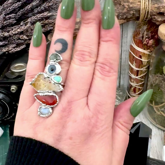 Multi Stone Moss Agate Glass Eye Turquoise Citrine Carnelian & Rainbow Moonstone Ring In Fine Silver Size 8 / Foxlark Collection