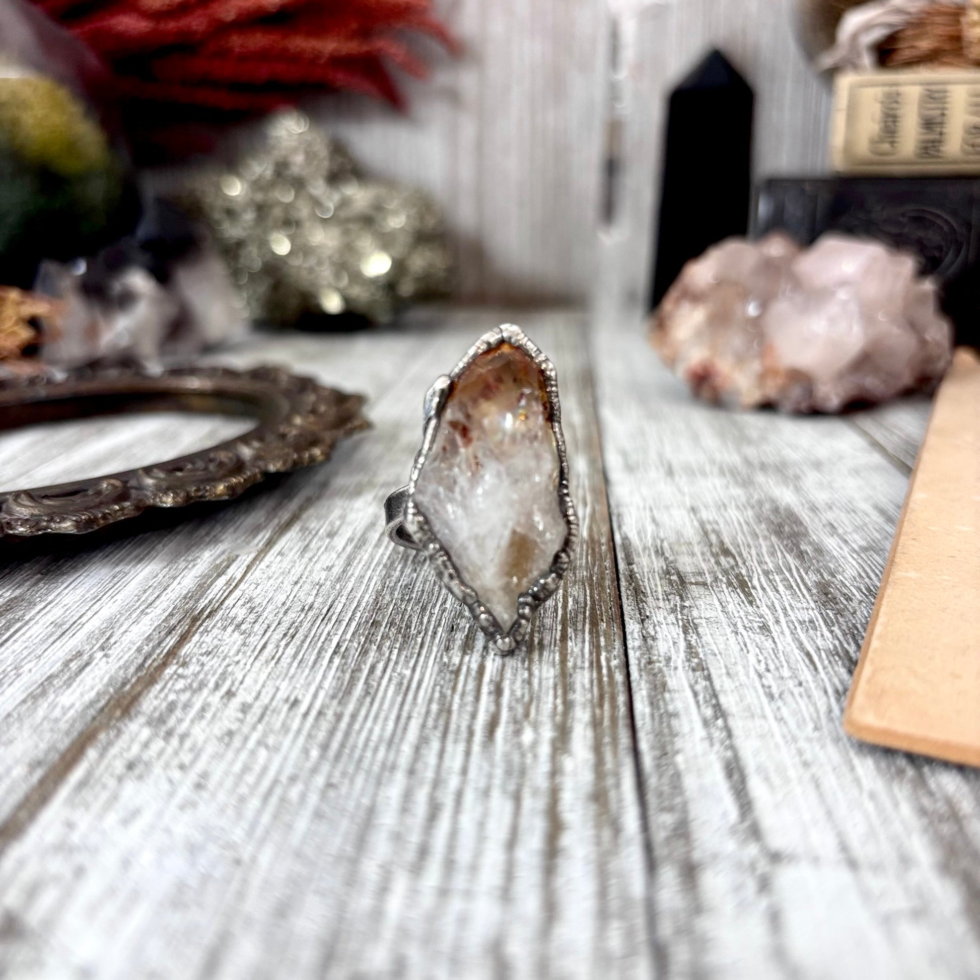 Get in touch with our contact page or you can always contact us on our FOXLARK Instagram www.instagram.com/foxlark or Facebook pages www.Facebook.com/foxlark , or through email foxlarkalchemy@gmail.comSlip a little magic onto your hand with this crystal fine silver ring. Sleek yet powerful, it radiates with energy, making it the perfect piece for anyone who loves a touch of power with their mysticism.