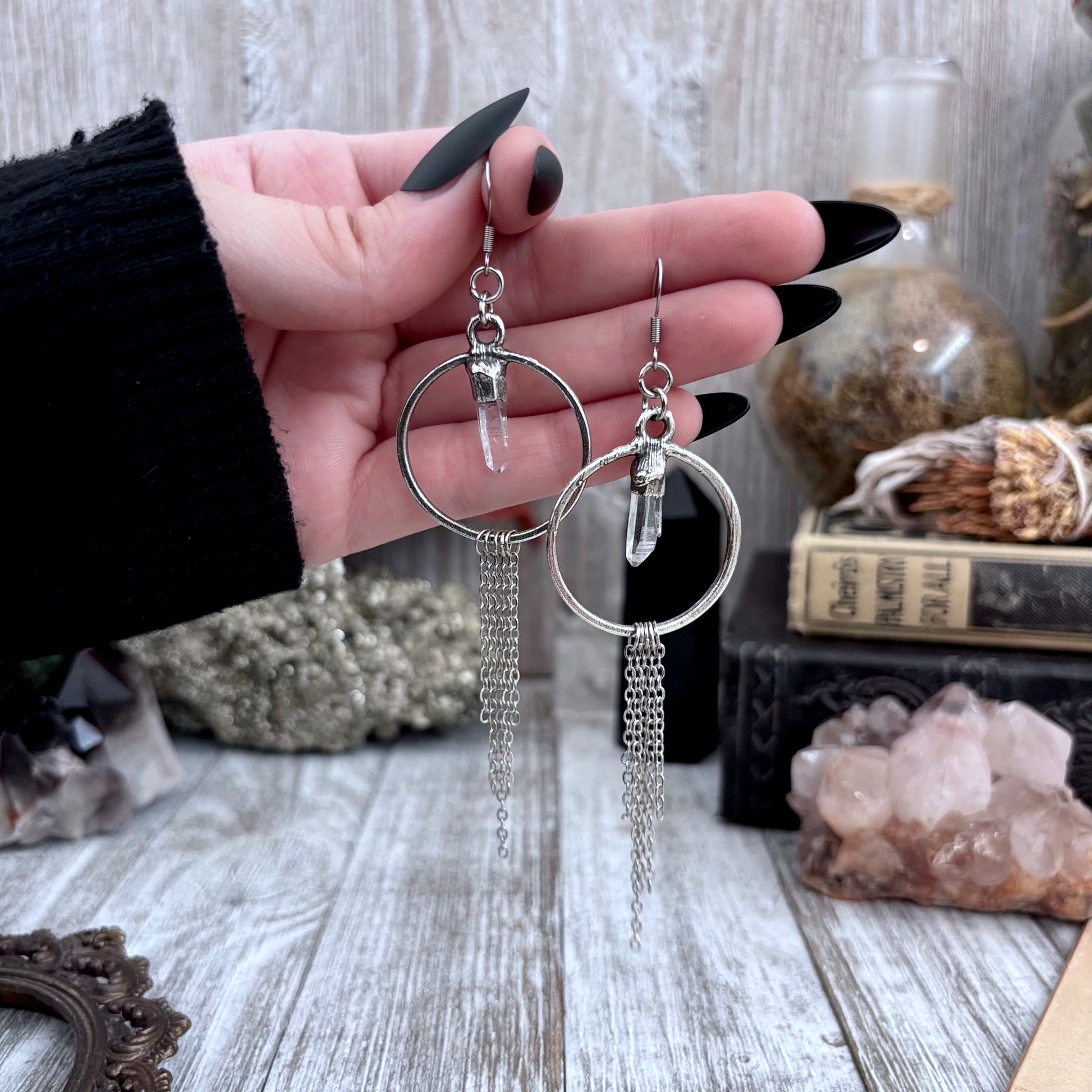 Raw Clear Quartz Hoop And Fringe Silver Crystal Earrings / Long Dangle Witchy Earrings