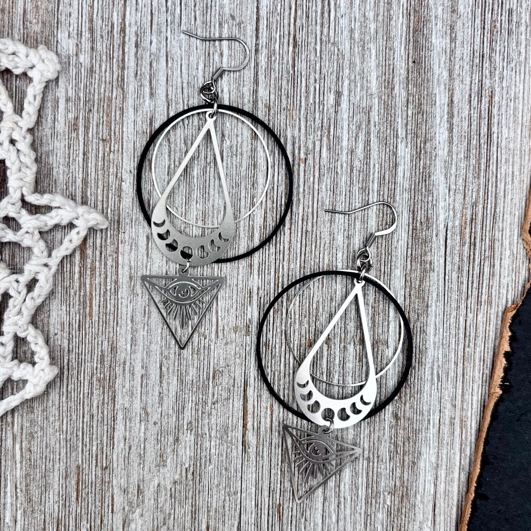 Stainless Steel All Seeing Eye Moon Phases Hoop Earrings / Long Dangle Earrings