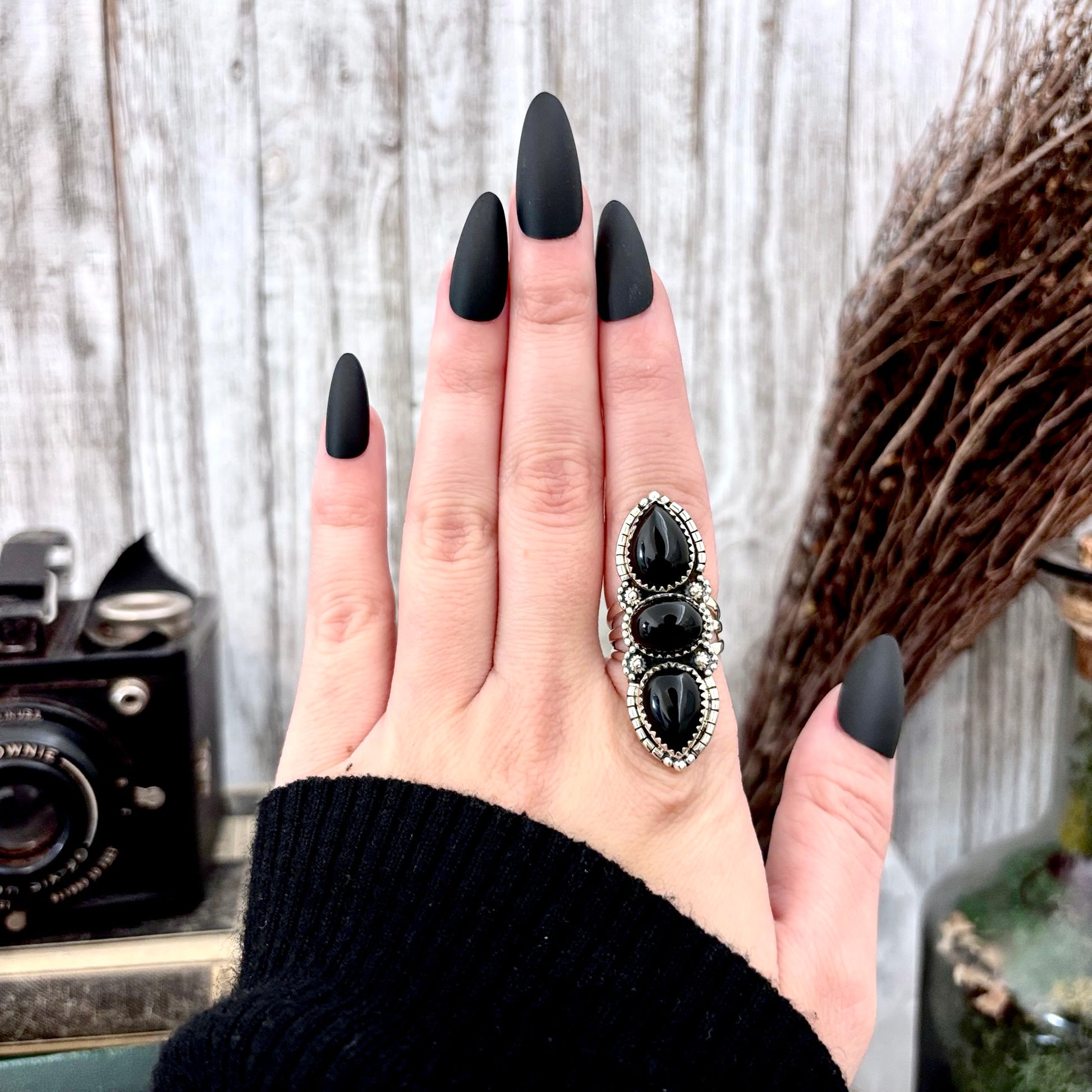 Three Stone Black Onyx Ring in Sterling Silver- Designed by FOXLARK Collection Size 6 7 8 9 10 11 / Big Crystal Ring Witchy Jewelry