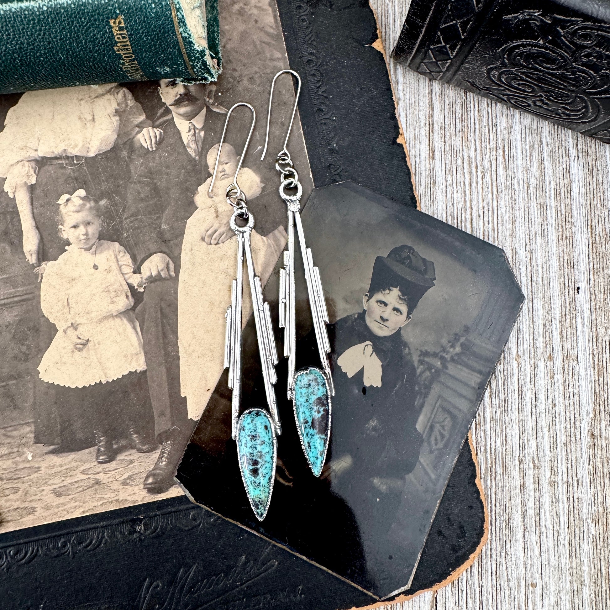 Turn up the edge with these fine silver Tibetan turquoise dramatic drop earrings. Long, lightweight, and built to move, they catch the light every time you turn your head. Just the right hit of shine for anyone who likes their jewelry a little bold.