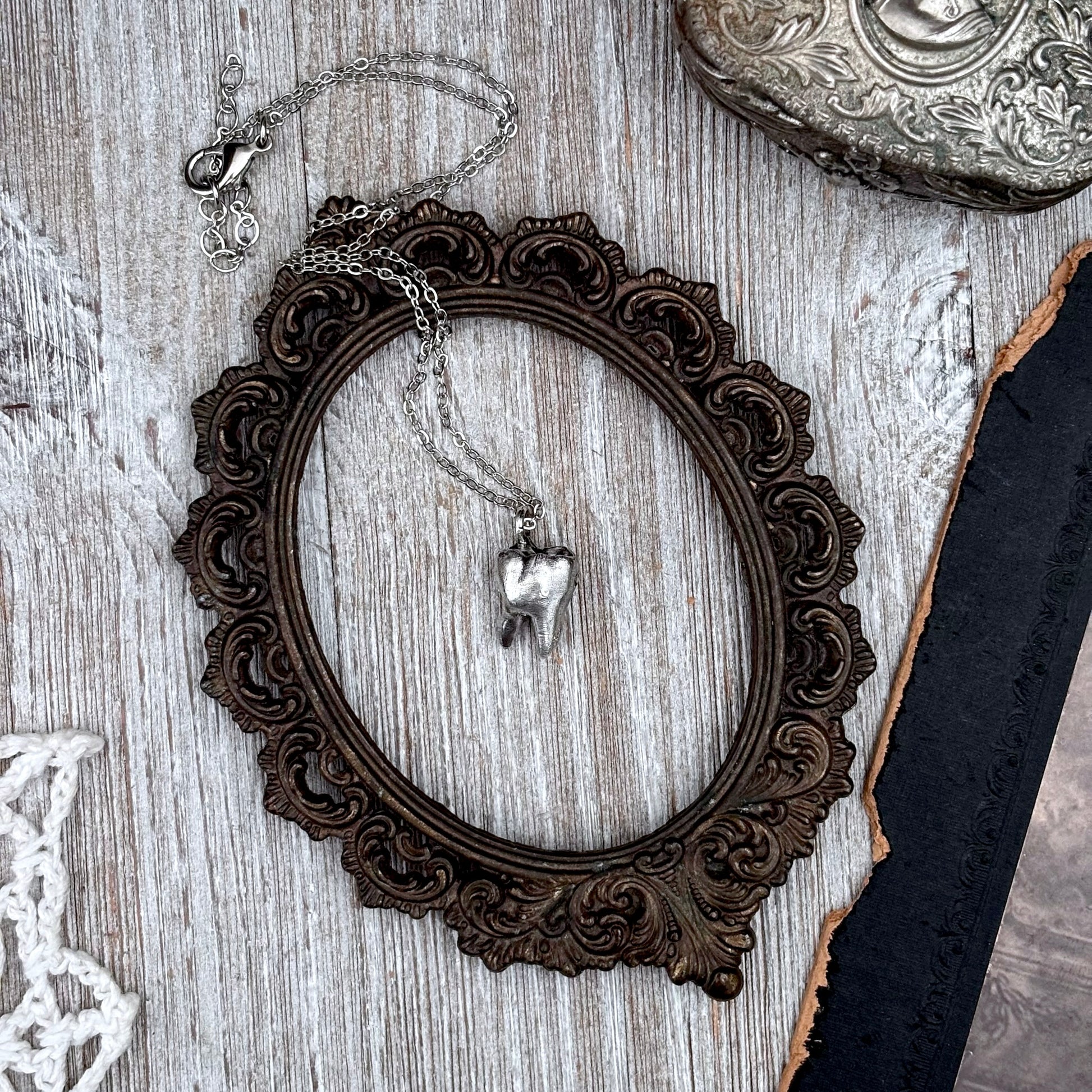 Get in touch with our contact page or you can always contact us on our FOXLARK Instagram www.instagram.com/foxlark or Facebook pages www.Facebook.com/foxlark , or through email foxlarkalchemy@gmail.comTooth necklace set in fine silver and given a vintage patina turning it into a unique statement necklace. This handmade necklace is perfect worn alone or layered with other pieces.